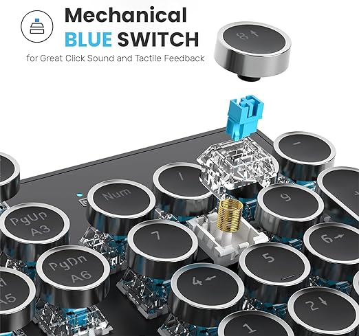 - [Retro Typewriter Style with Mechanical Keys] - Mechanical blue switch for ultimate gaming performance. The mechanical keys offer medium resistance, audible click sound & tactile feedback. Vintage steampunk round keycaps looks like a classical typewriter, brings you comfortable typing feeling & stable clicking touch.